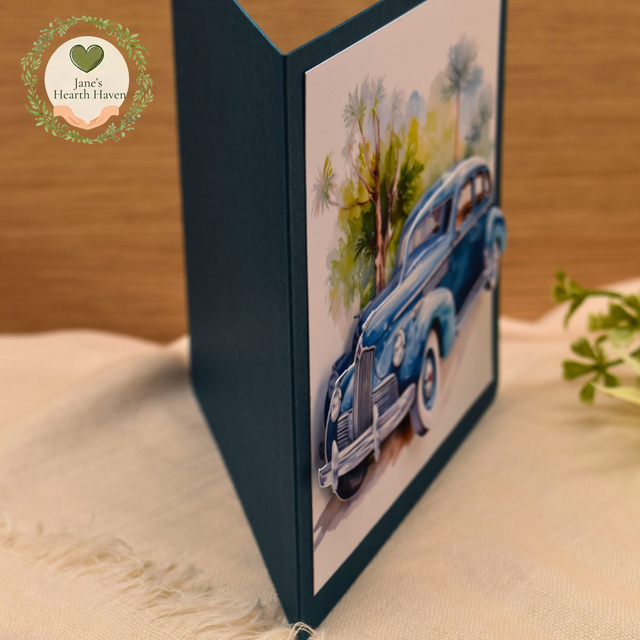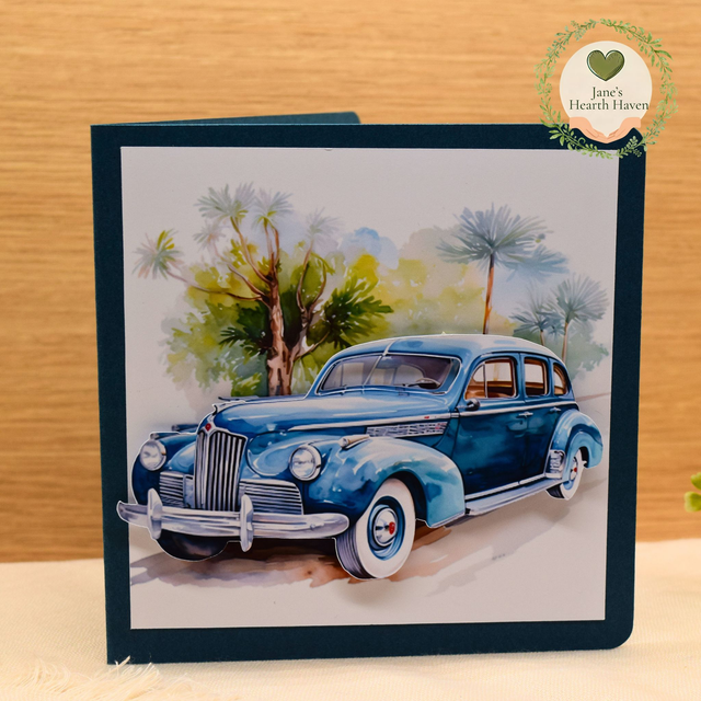Bring a touch of retro charm with my Vintage Blue Car card — a 5 x 5 greeting card featuring a classic blue car driving along a line of palm trees, set on a crisp white background. The card is mounted on a dark blue card base and comes with a white handmade envelope.